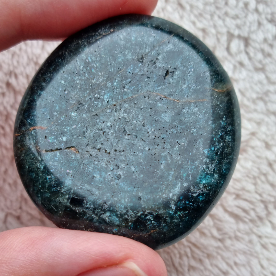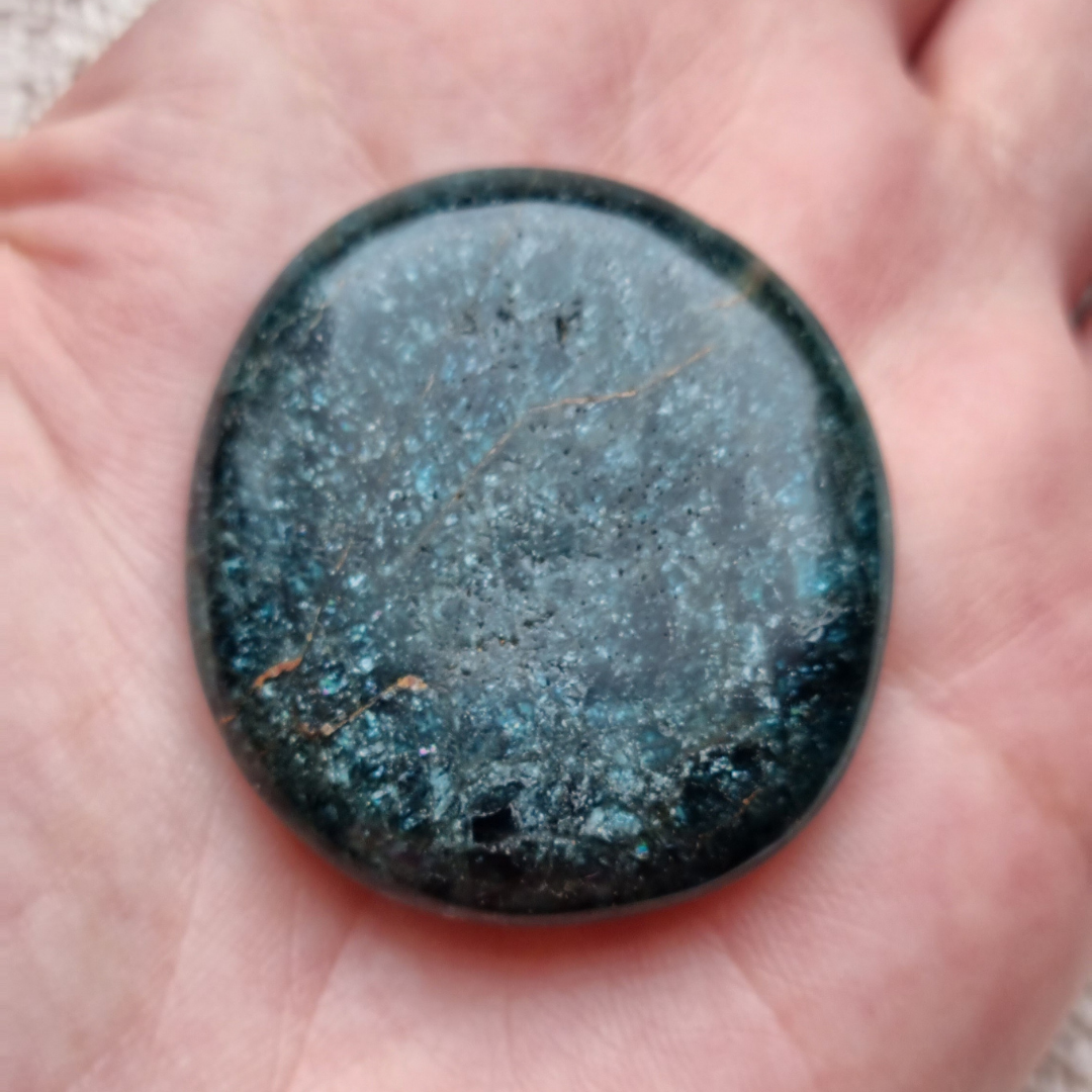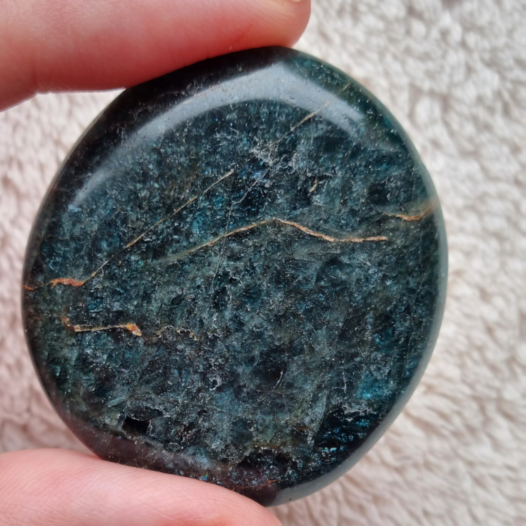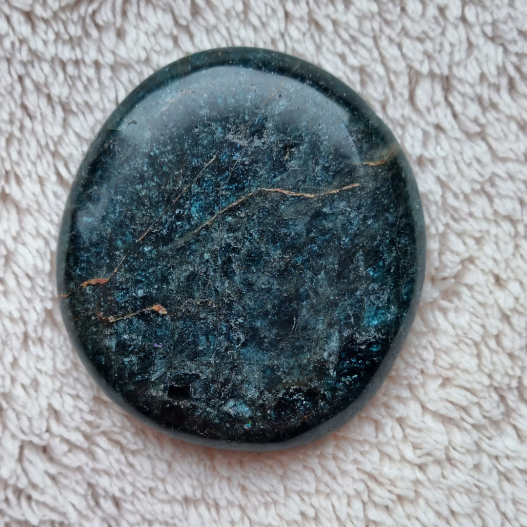 Deze apatiet zaksteen kan je gebruiken om mee te mediteren, om je intenties te visualiseren en bij je te dragen in je broek of handtas.