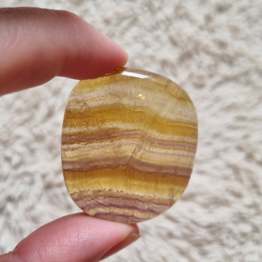 Deze fluoriet oplegsteen of zaksteen kan je gebruiken om mee te mediteren, om je intenties te visualiseren en bij je te dragen in je broek of handtas.