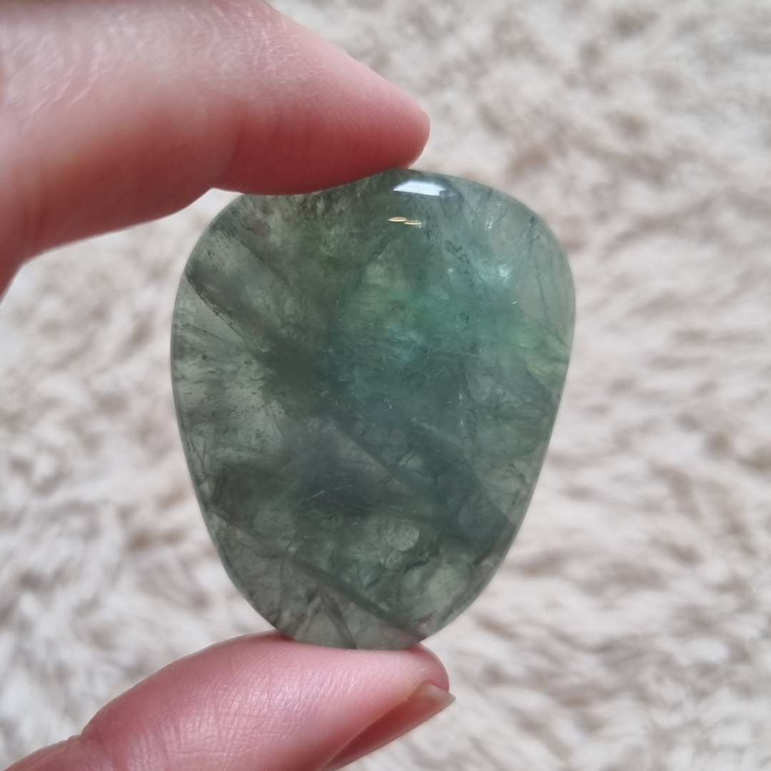 Deze fluoriet oplegsteen of zaksteen kan je gebruiken om mee te mediteren, om je intenties te visualiseren en bij je te dragen in je broek of handtas.