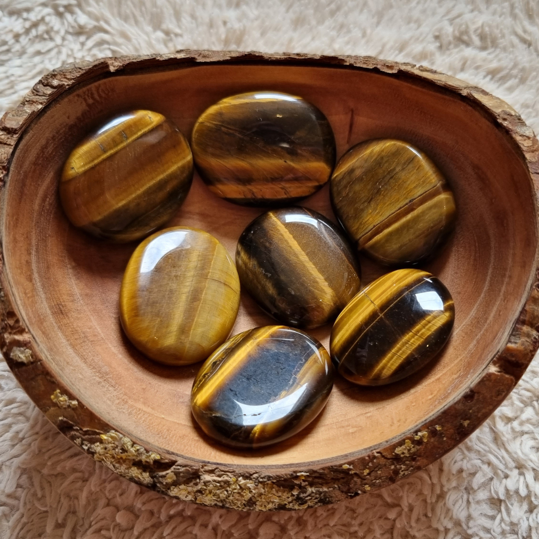 Deze tijgeroog oplegsteen of zaksteen kan je gebruiken om mee te mediteren, om je intenties te visualiseren en bij je te dragen in je broek of handtas.